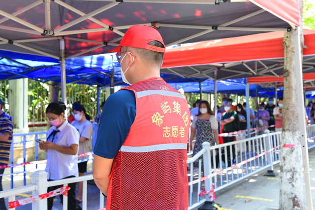 在湖里區(qū)興華社區(qū)核酸檢測(cè)點(diǎn),黨旗紅、志愿紅、象嶼紅交相輝映。近30位象嶼集團(tuán)志愿者頭頂烈日,盡心竭力做好隊(duì)伍秩序維護(hù)、查驗(yàn)健康碼等工作,引導(dǎo)市民保持合理間距,安全有序檢測(cè)。