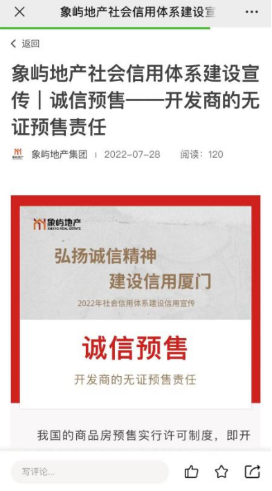 象嶼地產(chǎn)以報(bào)道誠(chéng)信企業(yè)案例、倡導(dǎo)高品質(zhì)產(chǎn)品和服務(wù),弘揚(yáng)全社會(huì)誠(chéng)信典型的精神。同時(shí),結(jié)合培育與踐行社會(huì)主義核心價(jià)值觀工作,象嶼集團(tuán)不定期通過(guò)微社區(qū)發(fā)布誠(chéng)信典型事跡,褒揚(yáng)誠(chéng)實(shí)守信的先進(jìn)典型:象嶼創(chuàng)投組織員工進(jìn)行《廈門市社會(huì)信用體系建設(shè)2022年工作要點(diǎn)》自行學(xué)習(xí)及廉潔從業(yè)書籍閱讀,提升員工對(duì)信用體系建設(shè)的理解;象嶼興泓公司組織先進(jìn)分享業(yè)務(wù)及安全骨干心路分享活動(dòng),銷售副總對(duì)各業(yè)務(wù)部門業(yè)務(wù)開展情況進(jìn)行點(diǎn)評(píng),展現(xiàn)了象嶼集團(tuán)引導(dǎo)廣大職工學(xué)習(xí)先進(jìn),發(fā)揮先進(jìn)的示范引領(lǐng)帶動(dòng)作用,為廈門這座全國(guó)文明典范城市創(chuàng)建助跑添力。