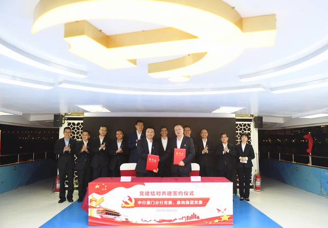 從歷史縱深處回望革命初心,賡續(xù)紅色血脈,傳承特區(qū)精神,10月12日,象嶼集團(tuán)黨委與中國(guó)銀行廈門市分行黨委在廈門黨史故事主題紅船“圖強(qiáng)號(hào)”上開(kāi)展黨建工作交流,并簽署黨建結(jié)對(duì)共建協(xié)議,以攜手深化國(guó)企黨建、推動(dòng)黨史學(xué)習(xí)教育常態(tài)化長(zhǎng)效化的實(shí)際行動(dòng),迎接黨的二十大勝利召開(kāi)。
