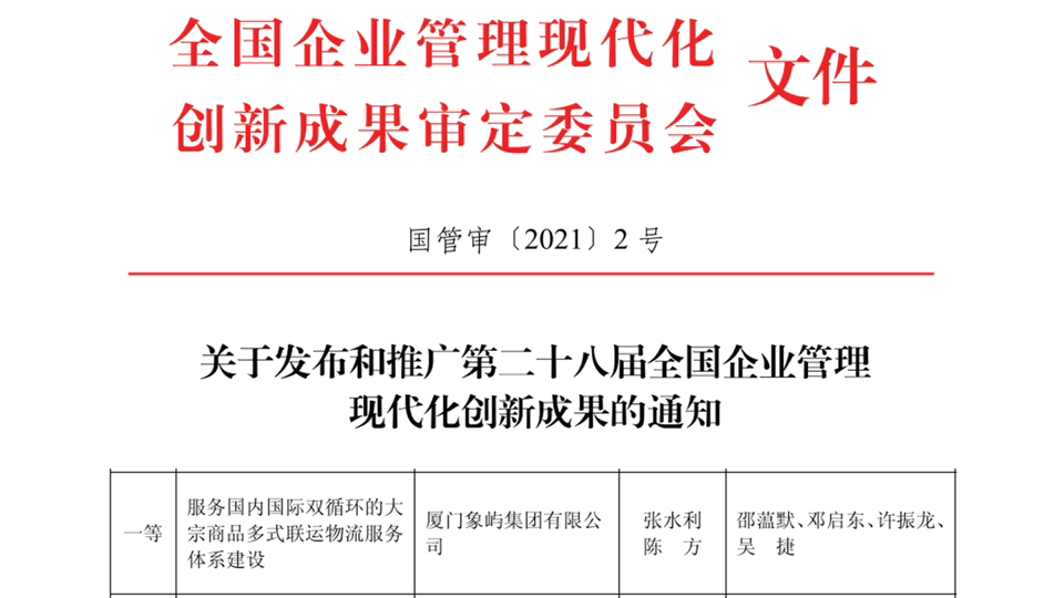 2022年,第二十八屆全國企業(yè)管理現(xiàn)代化創(chuàng)新成果名單發(fā)布,象嶼集團(tuán)憑借《服務(wù)國內(nèi)國際雙循環(huán)的大宗商品多式聯(lián)運(yùn)物流服務(wù)》榮獲一等獎,成為廈門首家獲評該獎項(xiàng)一等獎的企業(yè)。11月,倫敦設(shè)計(jì)獎(London Design Awards)結(jié)果出爐,上海天安象嶼西江悅榮獲建筑設(shè)計(jì)類別最高獎金獎,福州象嶼國貿(mào)星璟原獲展示空間銀獎。此外,2020-2021年度全國企業(yè)文化優(yōu)秀成果一等獎、2022金蜜蜂企業(yè)社會責(zé)任·中國榜“ESG競爭力·責(zé)任采購”獎、福建五一勞動獎狀、福建省優(yōu)秀企業(yè)家等重磅獎項(xiàng)也先后花落象嶼,凸顯社會對象嶼的高度認(rèn)可。