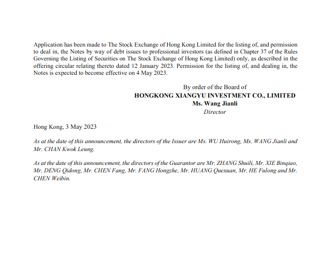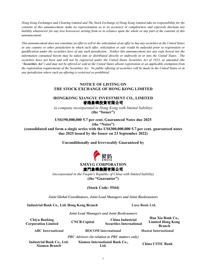 NOTICE OF LISTING ON THE STOCK EXCHANGE OF HONG KONG LIMITED