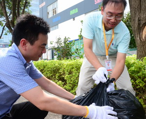 象嶼股份總經理鄧啟東放下手頭繁忙事務,組織全體員工利用午休時間清理象嶼保稅區(qū)一期。象嶼集團旗下各公司經營班子紛紛帶頭,示范作用感召越來越多的象嶼人積極參與進來。