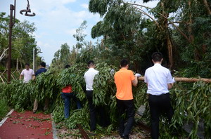 象嶼集團陳方副總裁、邵蕰默副書記、林俊杰副總裁等領導,上午奔波在島內外察看災情,為了參與志愿服務,中午匆忙扒了兩口飯就趕回來,率先垂范,身穿志愿者紅馬甲,頭頂烈日,撿樹枝、清障礙,汗水濕透了衣衫。