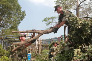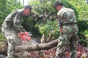 9月19日,子弟兵來了。這群已經(jīng)為廈門奮戰(zhàn)四天四夜的親人,來到廈門國際航運(yùn)中心,攜手象嶼人,一同清運(yùn)兩處景觀公園的斷樹殘枝。