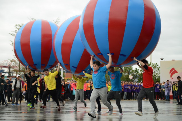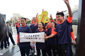 由于路面濕滑,奔跑的隊(duì)員狀況不斷。當(dāng)碩大的氣球險(xiǎn)些滑至地面時,隊(duì)員們咬緊牙,憑借團(tuán)隊(duì)的力量將氣球重新奮力托起。象嶼農(nóng)產(chǎn)的挑戰(zhàn)隊(duì)員摔倒后,迅速起身,繼續(xù)奮勇向前。這一幕幕拼搏的畫面,彰顯了象嶼人奮勇向前,勇?lián)?zé)任的精神。
