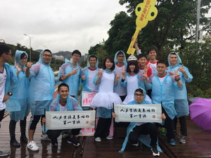 下雨天,依舊湮滅不了象嶼人的熱情。挑戰(zhàn)團(tuán)隊(duì)們紛紛冒雨接受挑戰(zhàn),4位隊(duì)員齊心協(xié)力地推動載著17位小伙伴的中巴車。