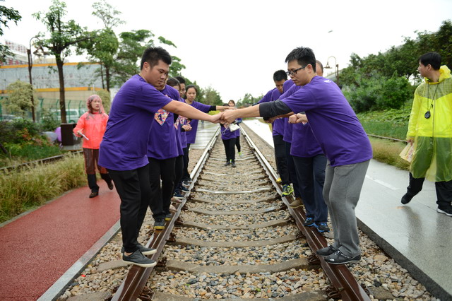 雨勢漸大,但為了節(jié)約時間,迅速完成任務(wù),許多隊(duì)員放棄穿戴現(xiàn)場發(fā)放的雨衣,疾步在雨中接受挑戰(zhàn)。有的隊(duì)員多次失誤,隊(duì)友們不僅不加以責(zé)怪,而是一齊鼓勵。他們手拉著手,一同喊著團(tuán)隊(duì)口號,憑著團(tuán)隊(duì)間的相互信賴與默契,冒雨艱難地完成了任務(wù)。