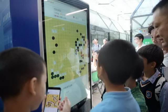 圍在一旁的圍棋小愛好者們摩拳擦掌,輪流在一旁圍棋互動(dòng)屏熱身,準(zhǔn)備進(jìn)場(chǎng)挑戰(zhàn)“棋智”!現(xiàn)場(chǎng)的圍棋圖書和人工智能圍棋閱覽交流區(qū)也熱鬧非凡。