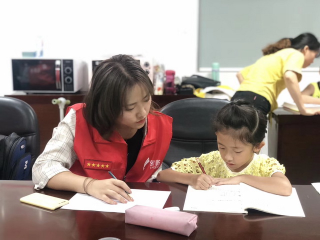看,這認(rèn)真教學(xué)的一對(duì)對(duì)。小嘉嘉苦惱于一篇“做家務(wù)”的作文,象嶼小姐姐便和他彼此分享做家務(wù)的心得,讓他有了靈感。當(dāng)稚嫩的面龐上泛起絢爛的笑容,志愿者的心里也滿是幸福。