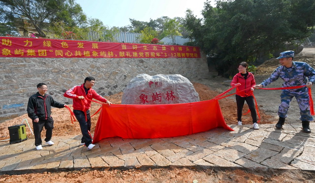 ▲象嶼集團(tuán)、駐廈某部隊(duì)、廈門外國(guó)語(yǔ)學(xué)校湖里分校、東榮社區(qū)領(lǐng)導(dǎo)共同為象嶼林揭碑。