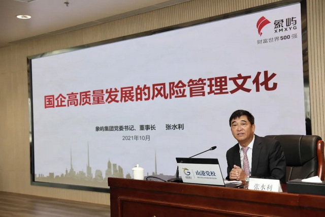 10月23日上午,應山東省港口集團的邀請,張水利董事長為山東港口領導干部做《國企高質量發(fā)展的風險管理文化》主題分享。他回顧了象嶼集團以市場化理念成就世界五百強的發(fā)展歷程,介紹了象嶼集團的風險管控文化,從戰(zhàn)略風險、人力資源風險、結構風險、制度風險等維度,分享了象嶼集團風險管控的新思考、新實踐,引發(fā)熱烈反響。
