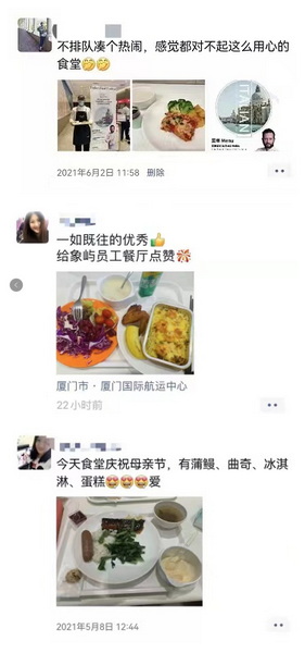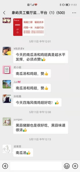 它更美在有家的感覺。每逢節(jié)日,餐廳用精心準(zhǔn)備的美食,送上滿滿的祝福。婦女節(jié)女神披薩、母親節(jié)養(yǎng)生湯、端午肉粽、中秋月餅……舌尖上的幸福,飽含著家的溫暖。餐廳還先后建立4個交流微信群,參與員工近2000人。象嶼家人們的每一項意見、建議,餐廳都會迅速答復(fù),并每周公示員工反饋問題的解決進展。在交流群里、在朋友圈里,員工的點贊之聲不絕于耳,餐廳平均滿意度保持在90%以上。