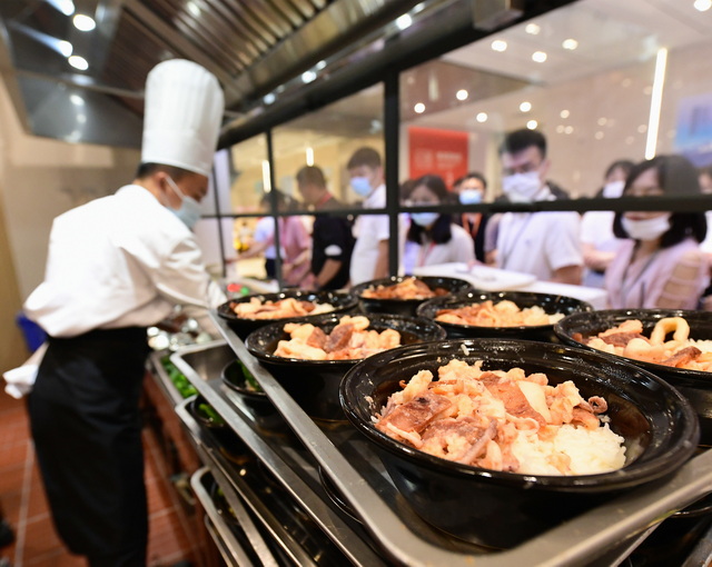 它美在菜品豐富。餐廳設(shè)置自助餐區(qū)、健康輕食區(qū)和四個特色檔口,每餐供應(yīng)菜品20余款,涵蓋煲仔飯、手工拉面、西餐、特色小吃以及各地口味餐食,做到一周菜品不重復(fù),每周至少推出一款新菜。