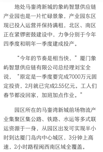 ‘公司在春節(jié)期間動員所有班組不停工,實際完成固定投資2.55億元。’廈門象嶼智慧供應(yīng)鏈有限公司黨支部書記、總經(jīng)理劉寶全介紹,當(dāng)前,公司正進一步加快項目建設(shè),全力沖刺首季‘開門紅’。”